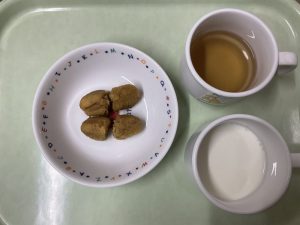 和風スイートポテト、牛乳、お茶