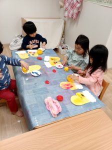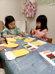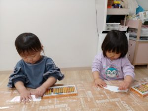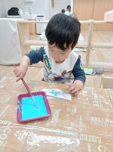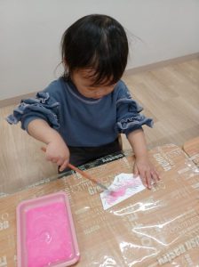 「あれ~?クレヨンがでてきたよ」とはじき絵を楽しみます。