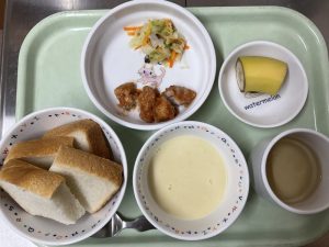 食パン、ケチャップチキン、フレンチサラダ、豆乳コーンスープ、バナナ、お茶
