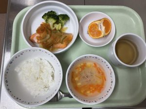 魚の甘酢餡、ブロッコリー、スープ、ご飯、みかん