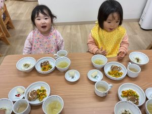 かわいい~とランチョンマットをじっと見るお友だち♪