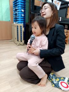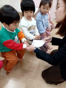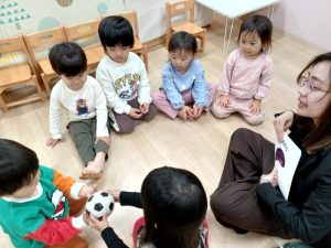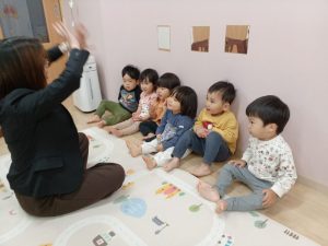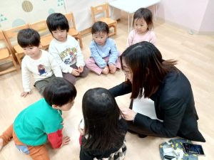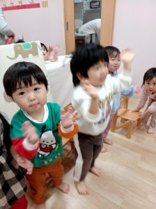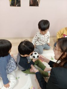 英語の歌に合わせてボールを回します。みんなドキドキ。
