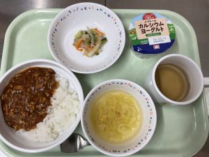 ハヤシライス、大根とツナのサラダ、スープ、ヨーグルト