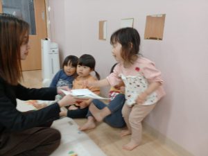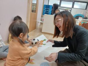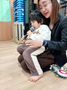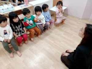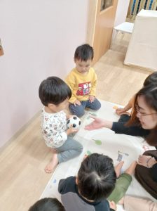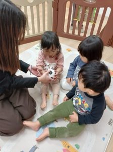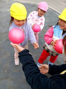 英語の歌に合わせてボールを回します。みんなドキドキ。