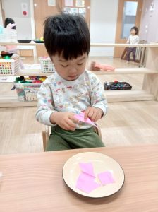 折り紙を器用にちぎっています。