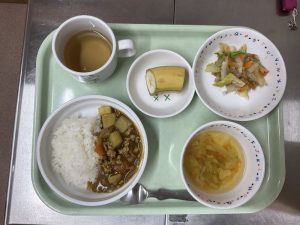 ポークカレー、甘酢和え、スープ、バナナ、お茶