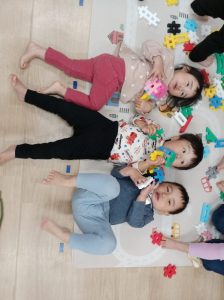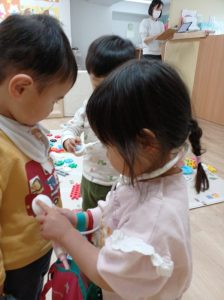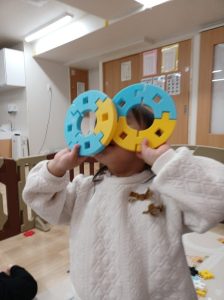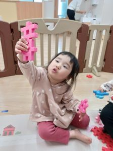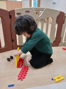 給食の後には、井形ブロックで形を作っています。