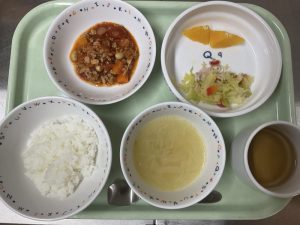 ポークビーンズ、キャベツソテー、オニオンスープ、ご飯、オレンジ、お茶