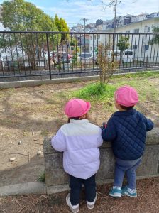 「ハトさん、いたね。」2人で仲良く観察をしています。