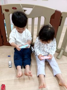 「2人でゲームやろう」とゲームに見立てて遊んでいます。