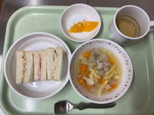 サンドイッチ、ミネストラスープ、オレンジ