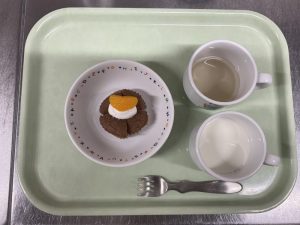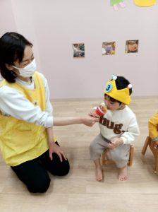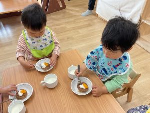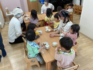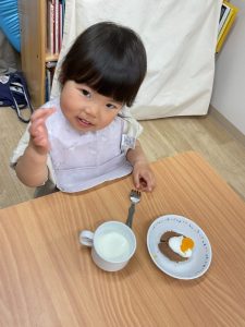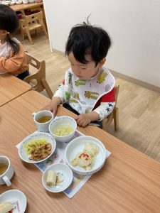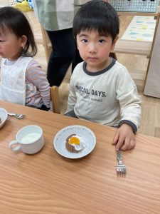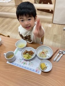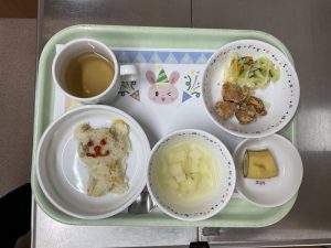 誕生児のお友だちは誕生日のランチョンマットで給食を食べます。