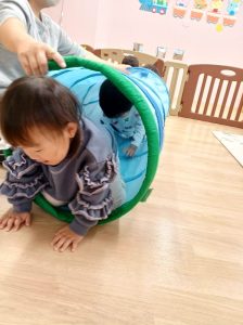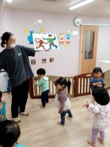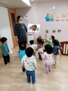 「できるかな?」の絵本を聞きながら歌に合わせて動物さんと