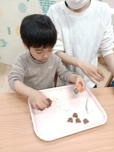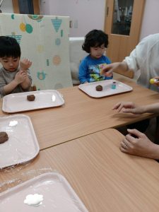 「柔らかくてむずかしい~」と言いながらも真剣に型を抜いています。