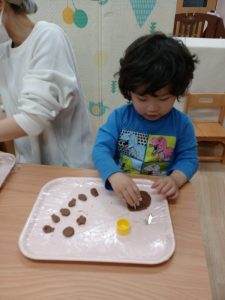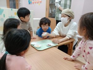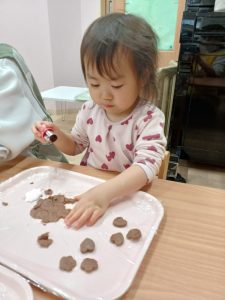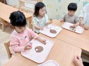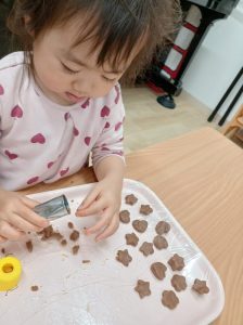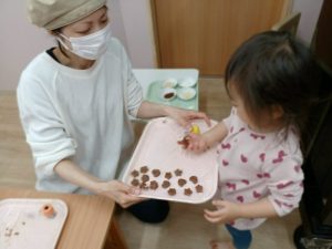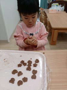 つき組さんは3月の食育「クッキーの型抜き」を楽しみました。
