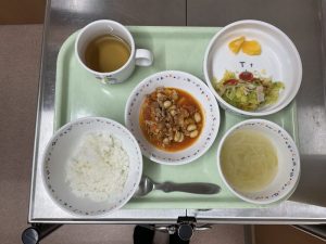 ご飯、ポークビーンズ。キャベツソテー、オニオンスープ、オレンジ、お茶
