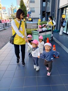 みんなで手繋ぎ散歩を楽しみながら、ふれあい公園までお散歩に