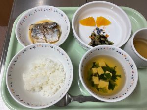 ごはん、魚の味噌煮、ひじきのサラダ、すまし汁、オレンジ